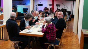 Nach dem Gottesdienst wurde der Raum umgestaltet zu einer großen gemeinsamen Vespertafel. mit einem reichhaltigen Buffet. In Gemeinsamkeit und Gesprächen lief der Abend aus.