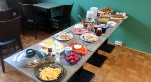 Nach dem Gottesdienst wurde der Raum umgestaltet zu einer großen gemeinsamen Vespertafel. mit einem reichhaltigen Buffet. In Gemeinsamkeit und Gesprächen lief der Abend aus.
