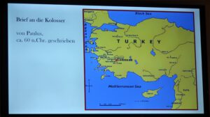 Claudia Klein bearbeitet in der Predigt den Paulusbrief an die Kolosser. In ihrer Betonung steht Jesus als Mittler, Lehrer und Rabi gleichzeitig als Gott mitten unter uns.